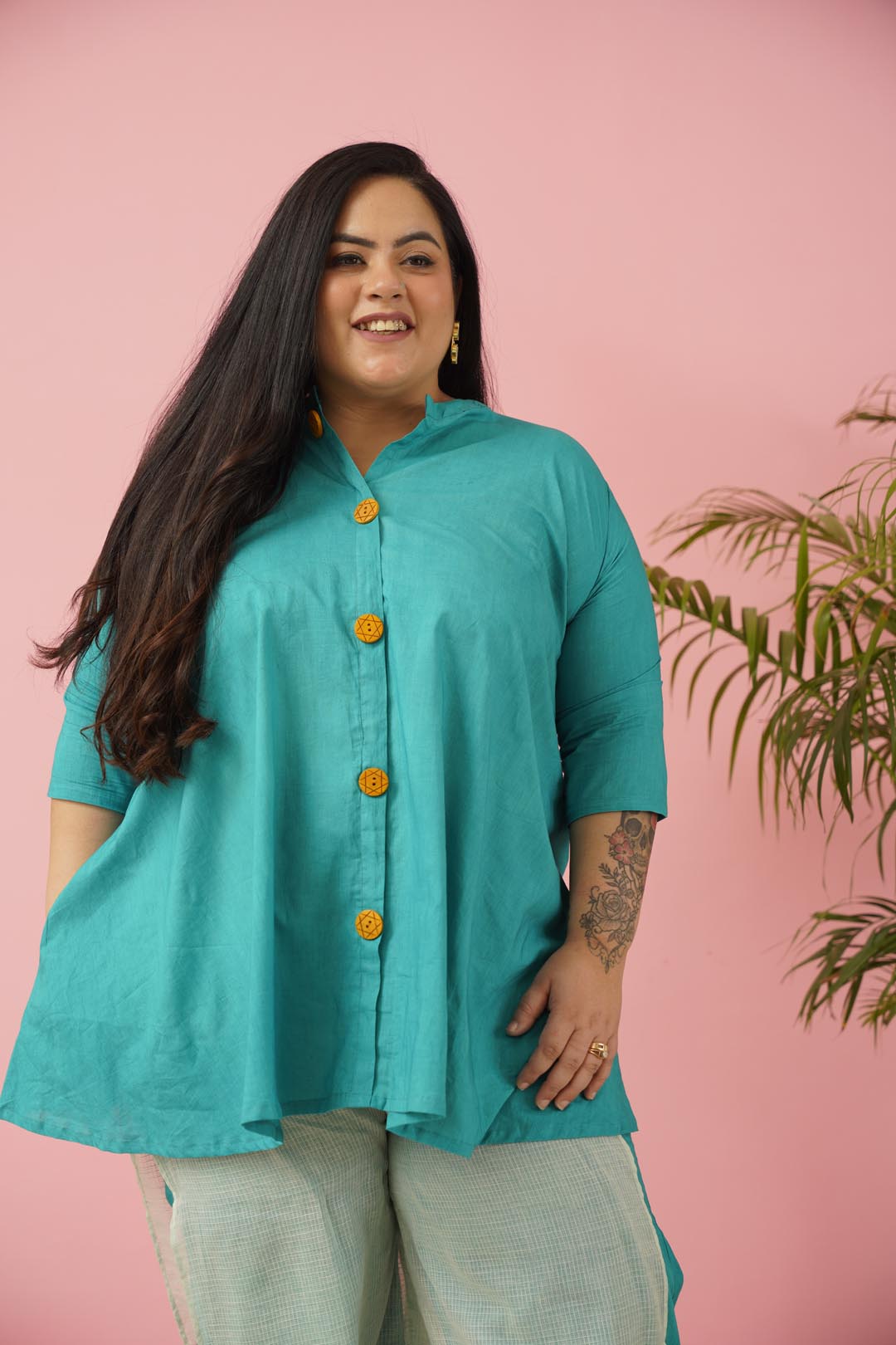 Bias Cut Stand Collar Neck Top with Front Wooden Buttons Pair with Double Layer Bottom,...