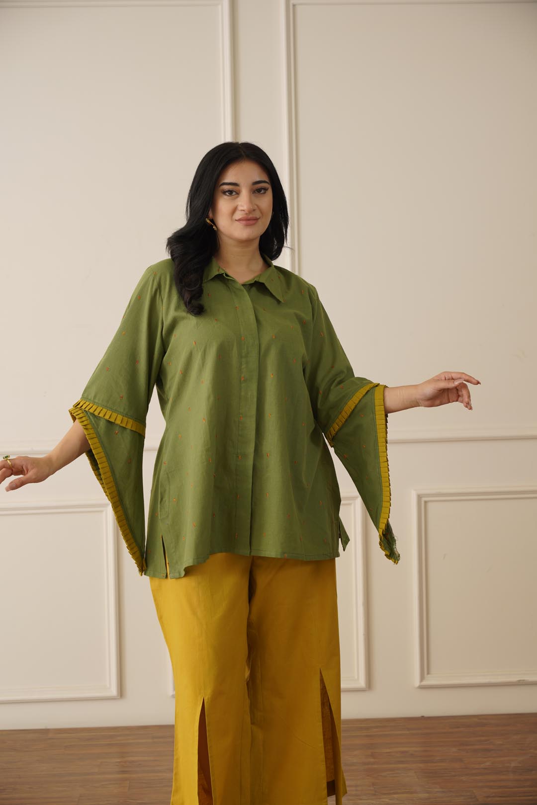 This Aline Flare Tunic Brown Co-ord Set Has a Shirt Collar And Sleeves With Pleated...