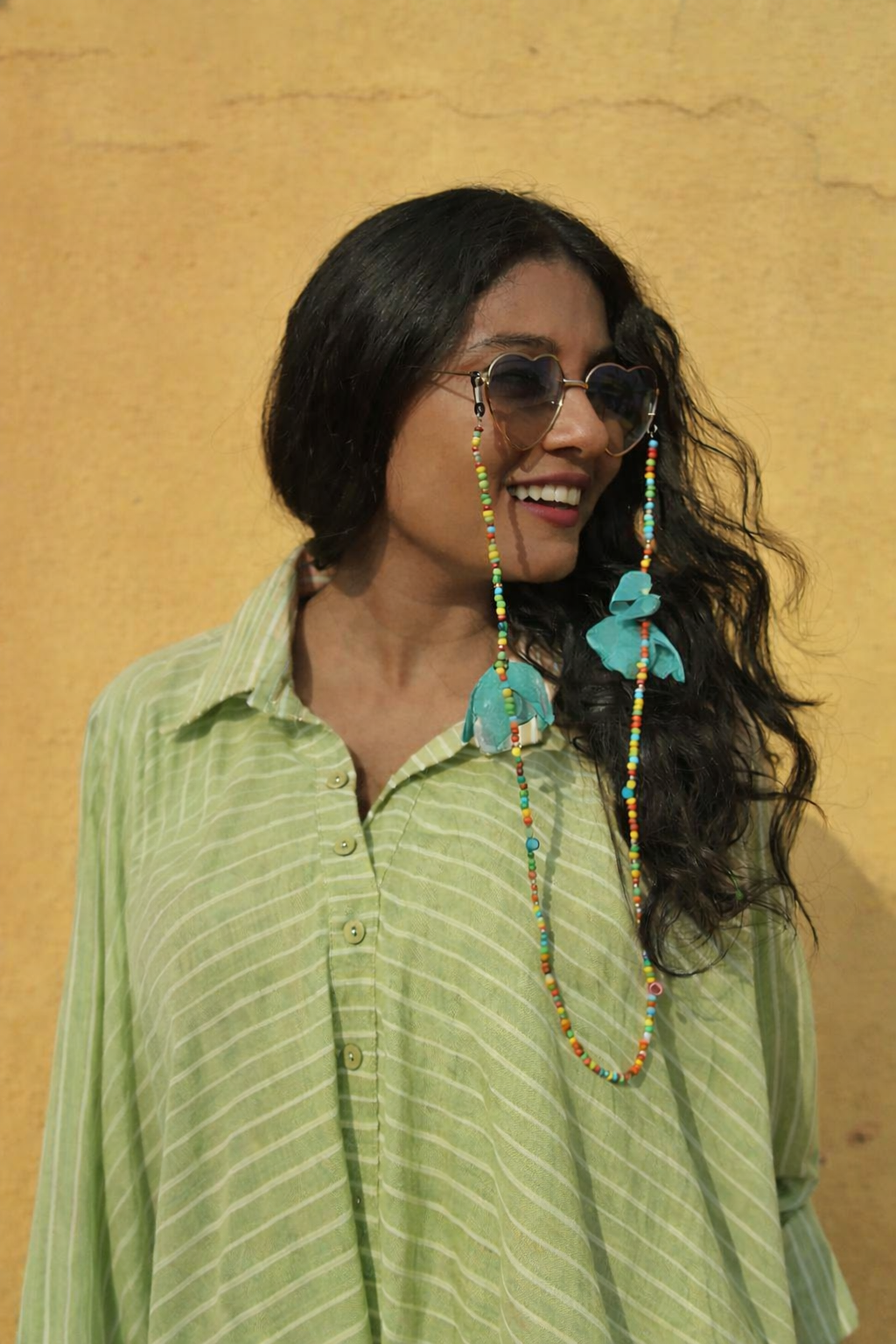 "Unleash your inner fashionista with Chic Lines! This contemporary twist on striped fashion features soft cotton fabric in a playful pink stripe, a chic shirt collar and a front button patti for added style. Plus, the soft and asymmetrical cut adds a touch of edginess to your wardrobe. Perfect for those who love to stand out from the crowd!"